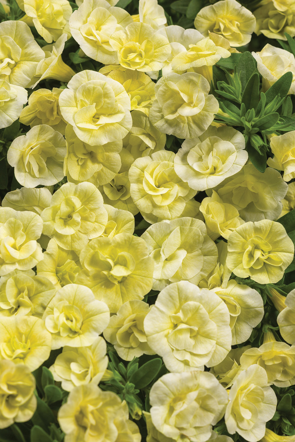 Abundant, small double petunia-like flowers all season on cascading growth; low maintenance. The soft yellow flowers are a dream.