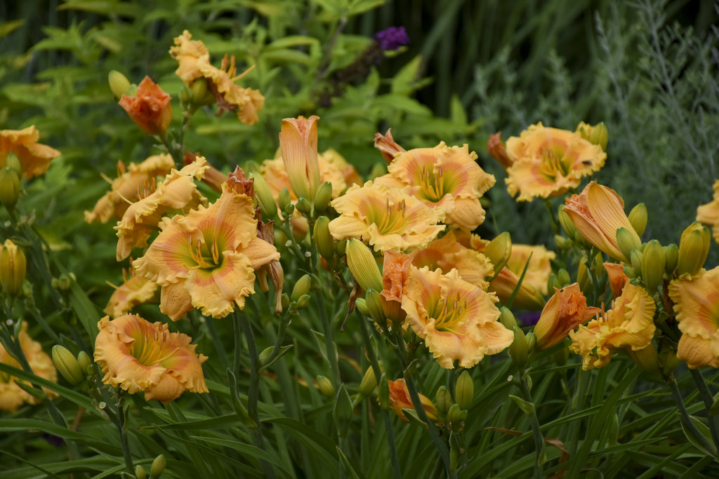 Orange mango petals with a light rose band are borne on strong, well-branched, heavily budded scapes. Flowers appear in midsummer and again later in the season.
