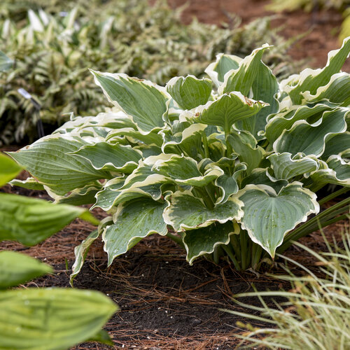 A ruffled hosta that will bring joy year after year. Heart-shaped, blue leaves have crisp, creamy white edges. Near white flowers.