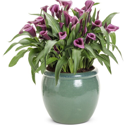 If you’re new to growing calla lilies, this is the place to start. Be My Destiny calla is one of the best varieties for pot production our growers have ever trialed. A strong yield, excellent vigor, uniformity of the crop and good disease resistance are all reasons our growers love this calla. Grape purple flowers with a deeper purple throat are produced in good numbers atop the slightly maculated, emerald green foliage which fills the pot fully.